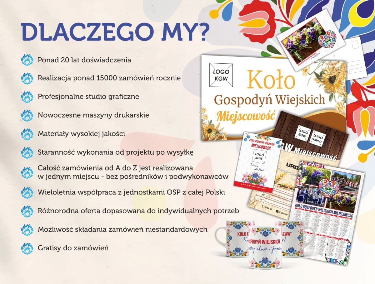 Wychodząc naprzeciw Waszym potrzebom, przygotowaliśmy szczególną ofertę dedykowaną Kołom Gospodyń Wiejskich. Pragniemy dostarczyć Wam profesjonalnie wykonane, indywidualne, spersonalizowane produkty, które pomogą rozpropagować Waszą działalność, wyróżnić Wasze Koło na tle innych oraz zasilić Wasze budżety poprzez sprzedaż materiałów w Waszej okolicy.